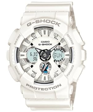 This Casio XL G-Shock is equipped with a clean all-white design with subtle gray accents, practical analog-digital display and rugged shock resistant design. Shock Resistant. Magnetic Resistant. 200 Meter Water Resistant. Mute Function. Auto LED light with afterglow. World Time: 29 times zones (48 cities plus UTC), daylight saving on/off, home city/world time swapping. 4 Daily Alarms and 1 Snooze Alarm. Hourly Time Signal. 1/1000 Second Stopwatch.. Measuring capacity: 99:59,59.999. Measuring modes: Elapsed time, lap time, split time. Others: Speed (0-1998 units/hour), Selection distance input (0.0-99.9). Countdown Timer.. Measuring unit: 1 second. Countdown range: 24 hours. Countdown start time setting range: 1 minute to 24 hours. (1-minute increments and 1-hour increments). Other: Auto-repeat. Full Auto-Calendar (pre-programmed until the year 2099). 12/24 Hour Formats. Accuracy: plus/minus 15 seconds per month. Battery: CR1220. Approximate battery life: 2 years. Module 5229. Size of case: 49.6 x 47.8 x 15.7mm. Total weight: 59g.