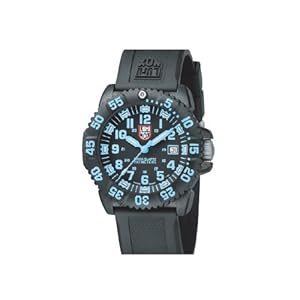 Perfect for low-light or no-light situations, the Luminox Men's Navy SEAL Colormark watch glows 100 times brighter than other luminous watches, which allows for easier visibility. This timepiece This versatile timepiece is constructed with a 48-millimeter polyurethane case and matching durable polyurethane band, which includes a buckle clasp with safety mechanism. Vibrant blue Arabic numerals contrast with the classic black dial, while smaller blue numerals mark the 24-hour clock. In addition, a handy date calendar rests at the three o'clock position, and the unidirectional, textured, polyurethane bezel features striking blue minute indexes for easy readability. Powered by analog-quartz movement and protected by a durable mineral dial window, this watch is preferred by US Navy SEALs and US Air Force Pilots, and is water resistant to a depth of 660 feet.